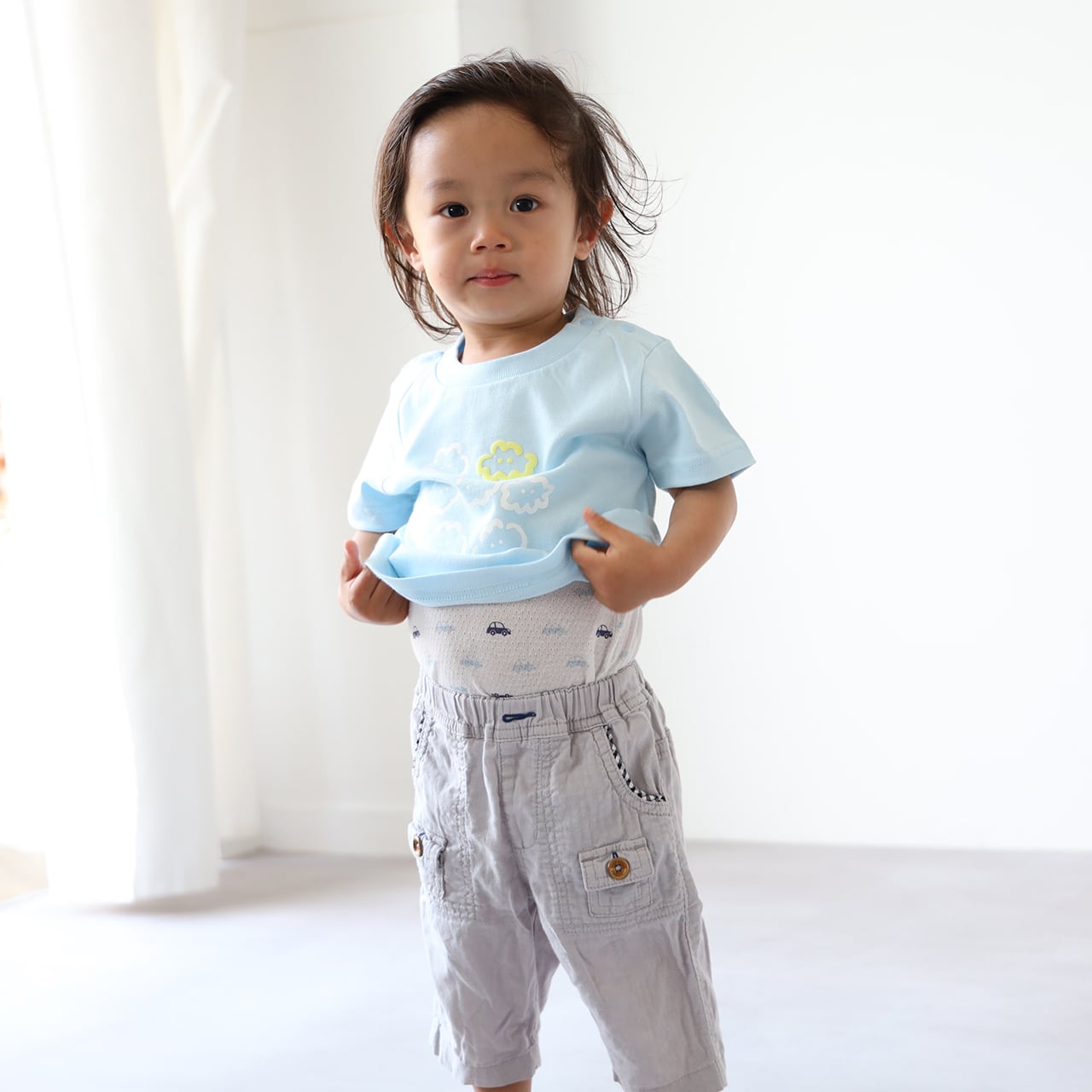 度重なる洗濯でもよれにくい、こどもたちの笑顔を支える一枚です。